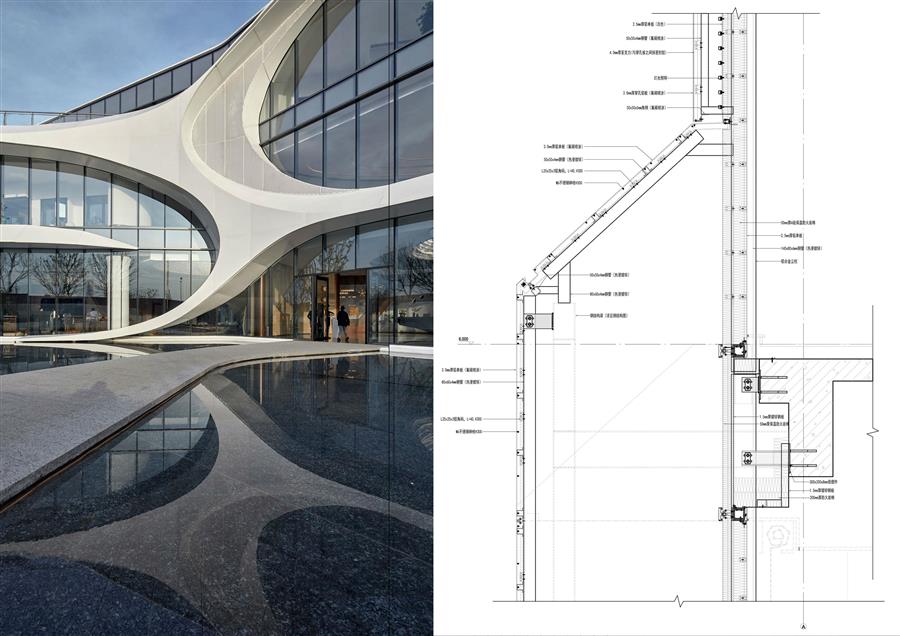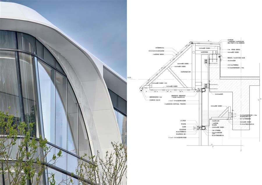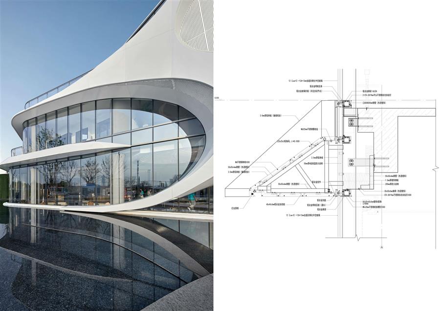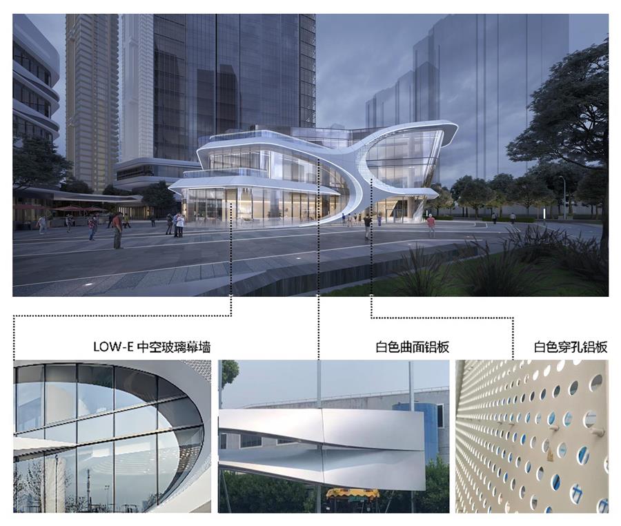 建筑主體材料以玻璃幕墻和純白色穿孔鋁板為主。玻璃幕墻使室內(nèi)外互為景觀,保證了良好的視覺通透性;珍珠白色鋁板經(jīng)過精細(xì)的節(jié)點(diǎn)加工,構(gòu)成曲面圍護(hù)體系,如白云般輕盈的,在白日與夜晚體現(xiàn)出不同的魅力。
