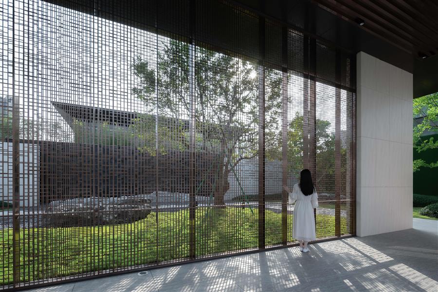 當(dāng)踏近展區(qū)入口,端莊典雅的門堂極具儀式感,簡約中式的格柵,似紗如縵,輕籠遠(yuǎn)山,內(nèi)庭的綠意婆娑朦朧可見,隔柵望山,款款而行,優(yōu)雅間步步生禪意。
