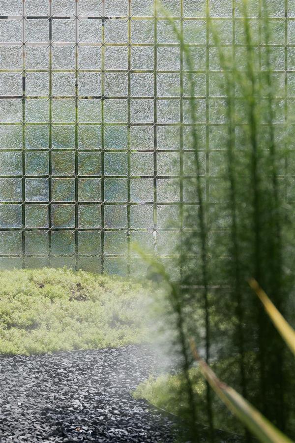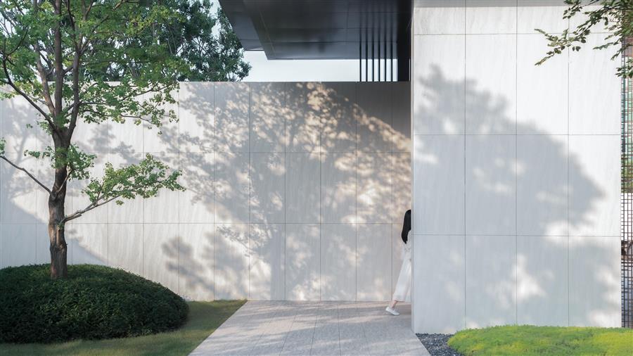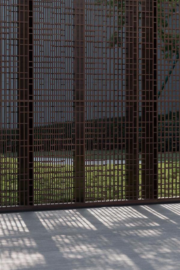 信步轉(zhuǎn)場之間,由山野歸林間,是一方返璞歸真的自然禪境,開闊的綠野有悠閑的雕塑,似踱步于浮洲,如停駐于綠波,寫意舒朗的自然景觀通過景窗、轉(zhuǎn)角、格柵變幻出更多的層次和感受,且將這份適意融入眼前的自然風(fēng)物中,隨心去暢游。