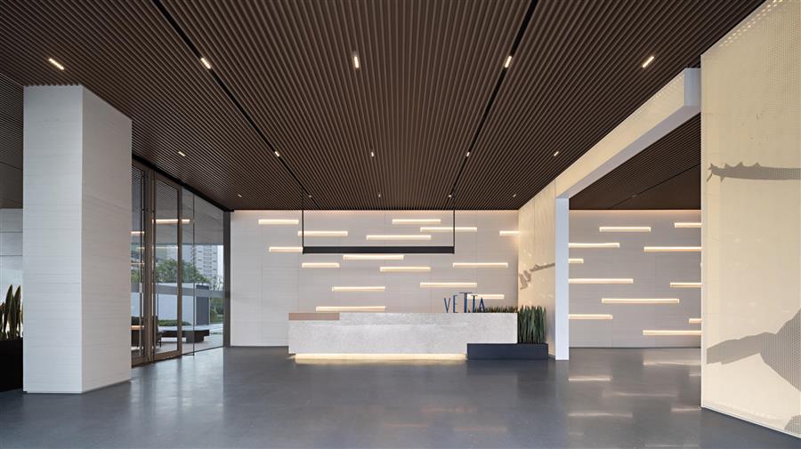 接待前廳刪繁就簡,借助石材與金屬的穿插組合,鏤空錯落的背景墻,輔以燈光的點(diǎn)綴效果,層次感與格調(diào)性頓生,予人端莊大氣的視覺觀感與心境體驗(yàn)。