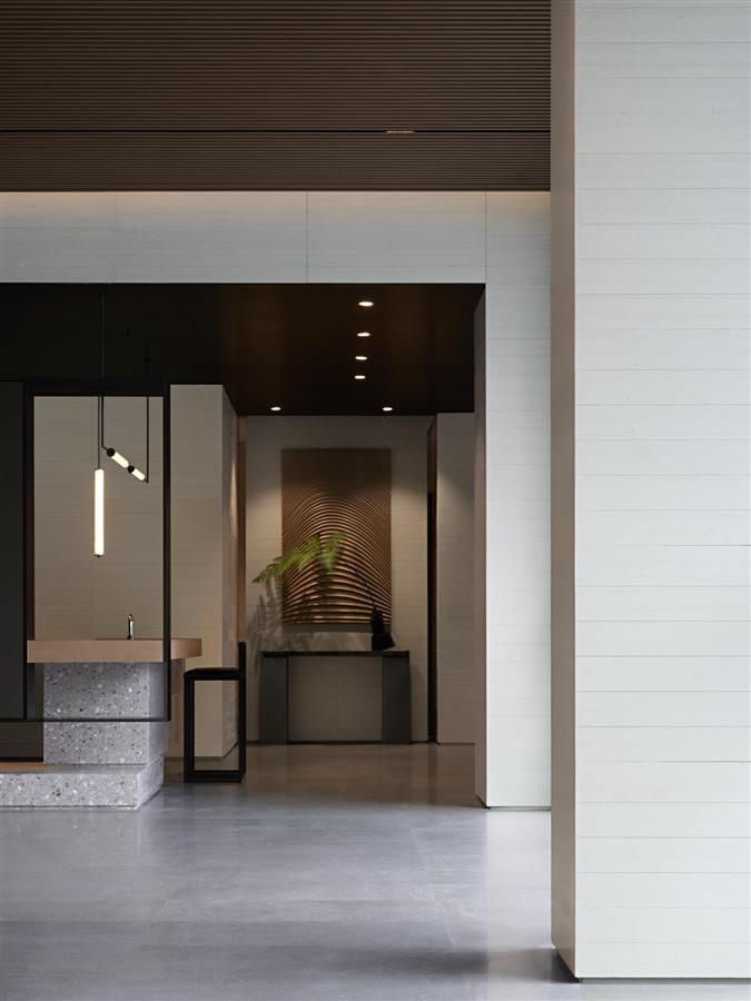 沙盤區(qū)的頂面格柵、立面背景墻皆由接待前廳一體延展而來,形成了縱深的陣列感,無限廣垠,又以顯著的線形指向,呈現(xiàn)出虛實(shí)交替的美學(xué)意境。