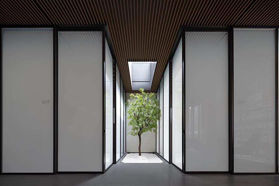 兩個VIP室延續(xù)簡潔干練的筆觸,大片的格柵、利落的塊面孕育出素雅基調(diào),綠意妝點(diǎn)則為其注入生機(jī),彼此交匯,恰如其分的鋪展開安謐幽然的氣氛。