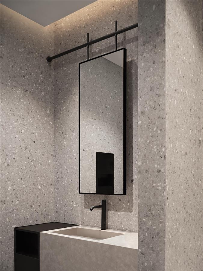 在衛(wèi)生間注重運(yùn)用解構(gòu)手法,讓不同材質(zhì)碰撞調(diào)和,高低起伏、明暗交織,充分調(diào)動視覺張力。