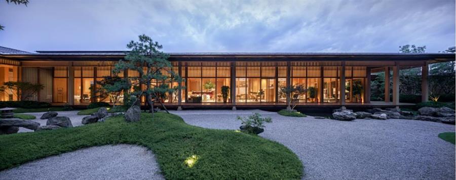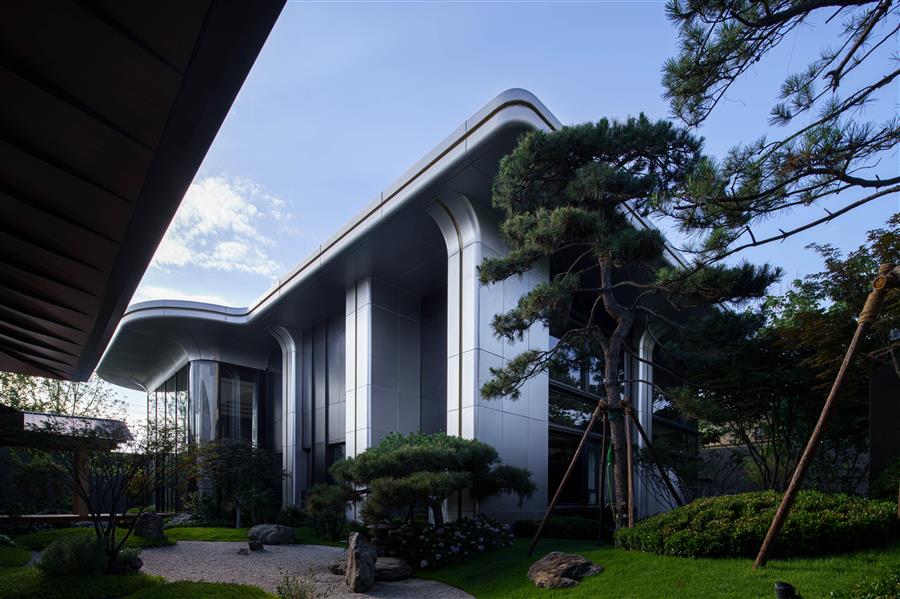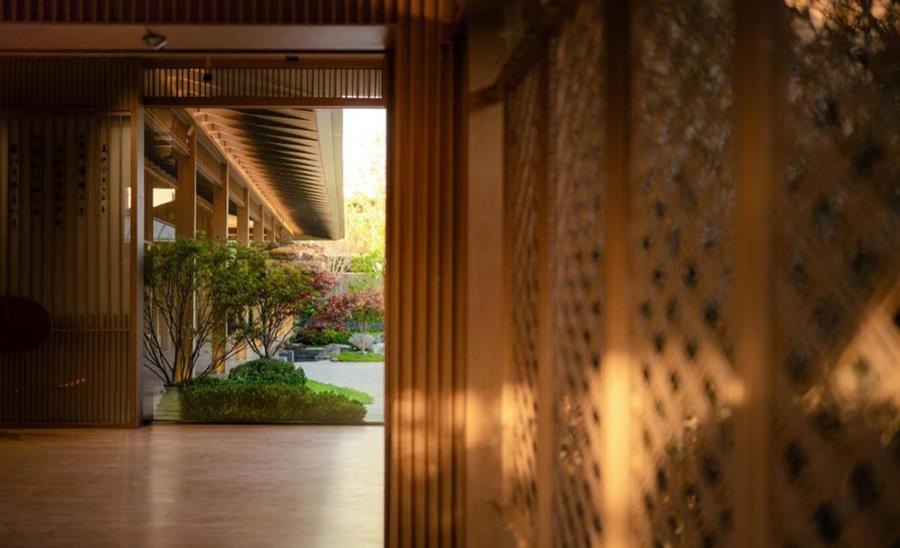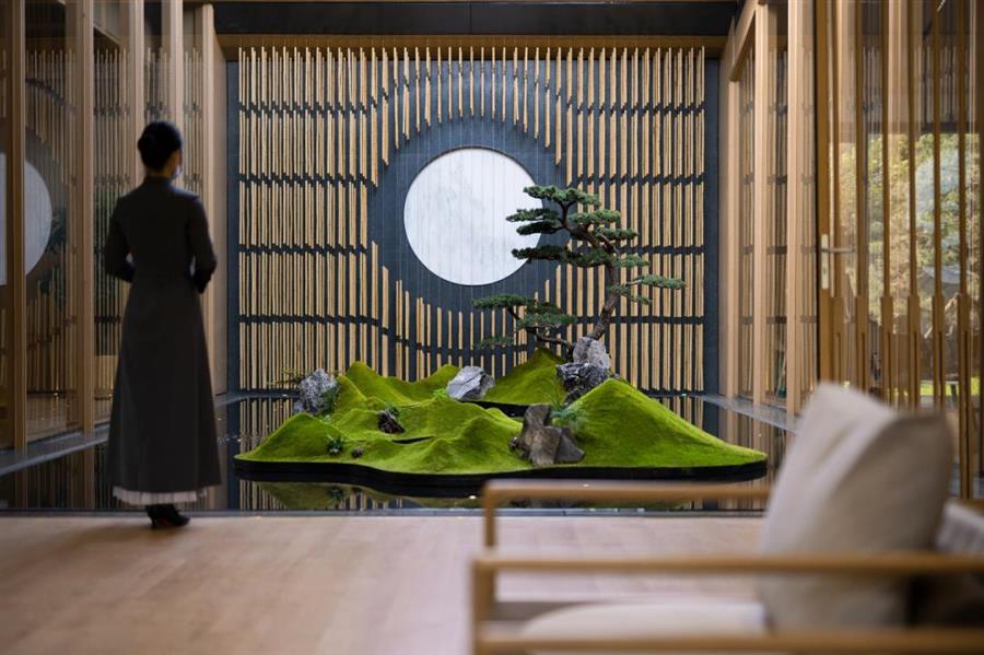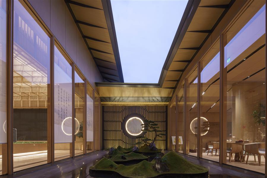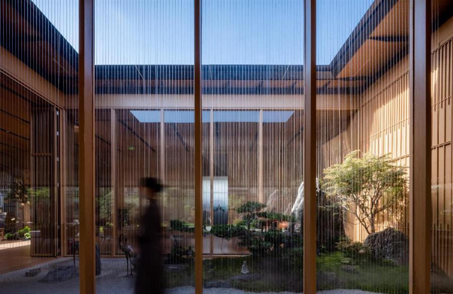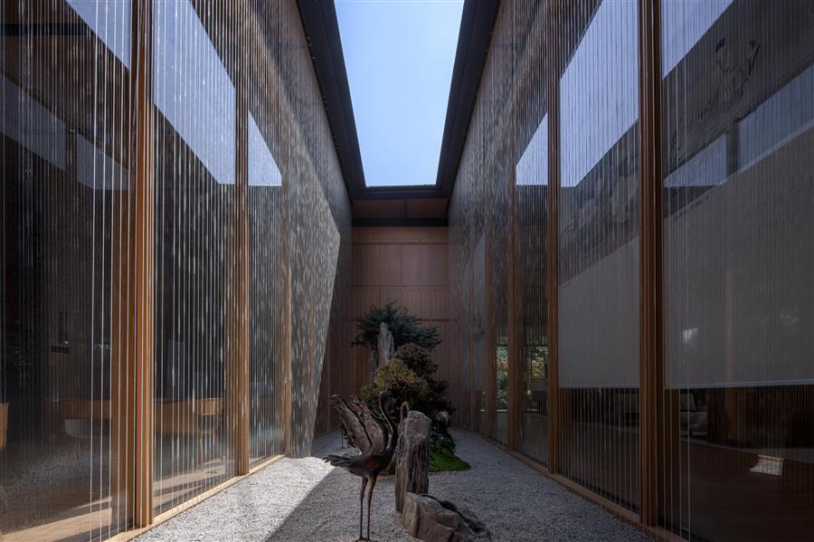 穿越連廊來到接待區(qū),山石曲徑,庭院深深幾許清幽,傳達(dá)一種簡(jiǎn)單、平和、開放與包容的生活態(tài)度,像枯山水里蘊(yùn)含著泰然,是精神層面的悠閑自得,路轉(zhuǎn)峰回,豁然開朗。置身于清雅、平靜的空間環(huán)境,領(lǐng)悟場(chǎng)所內(nèi)蘊(yùn)含的精神之美。
