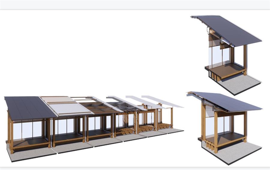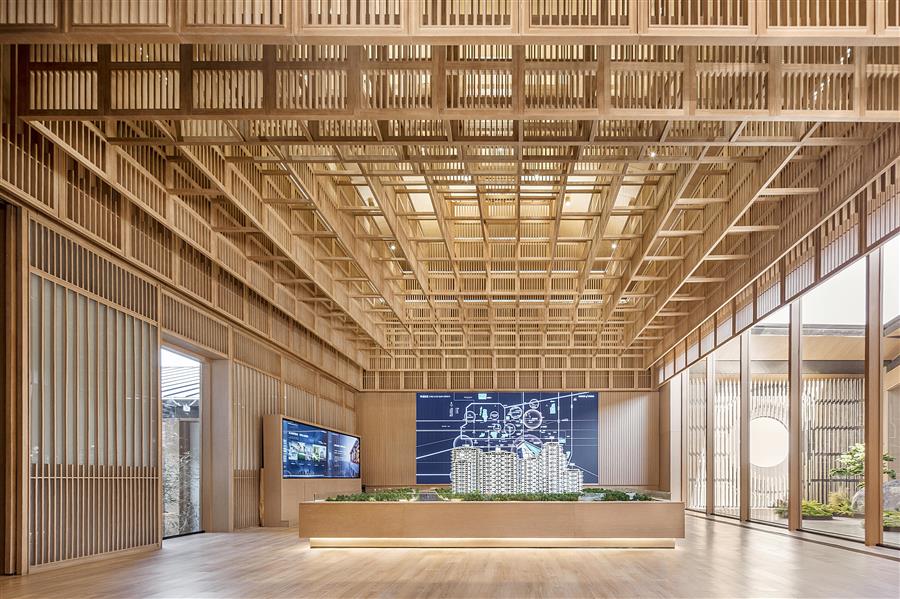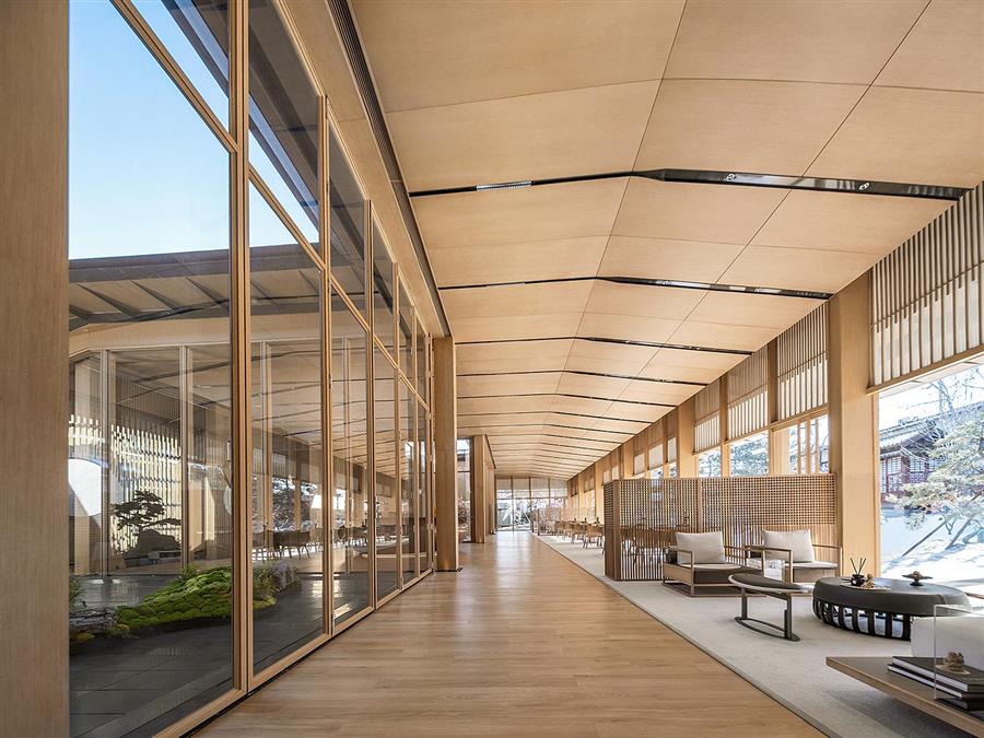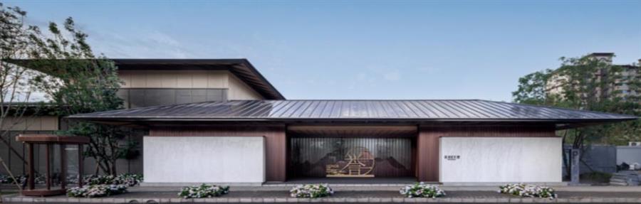 入口處建筑體量厚重、格局寬敞、營(yíng)造沉穩(wěn)大氣之勢(shì);超尺度屋檐呈水平向延展,表達(dá)友好、謙遜的歡迎姿態(tài);屋檐下的木制格柵,至素至簡(jiǎn),材質(zhì)古樸自然;建筑簡(jiǎn)約的形體輪廓,勾勒出內(nèi)在的意蘊(yùn),傳遞自然平和的生活觀。