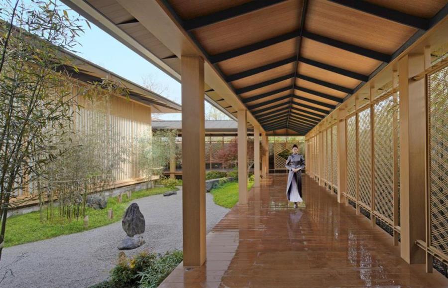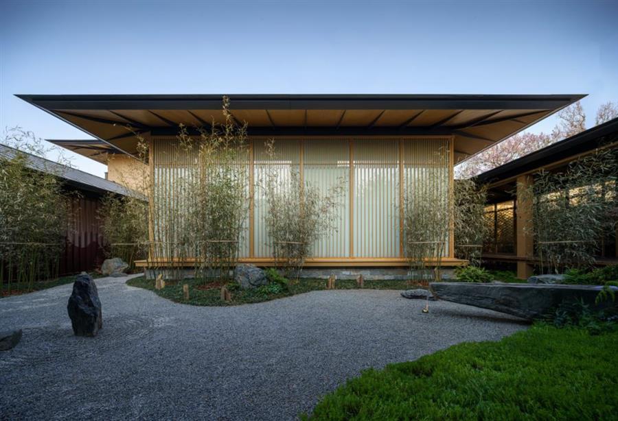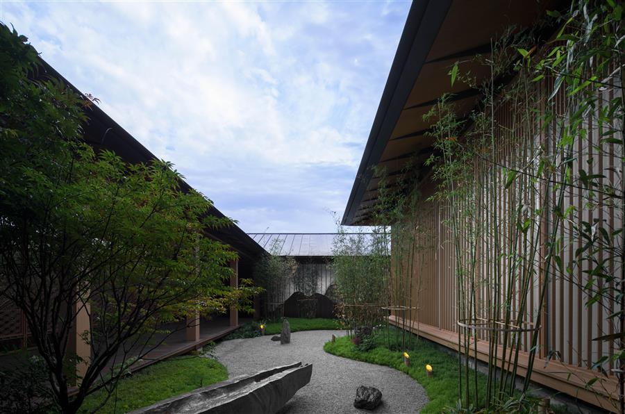 由入口處進(jìn)入內(nèi)部空間,竹子沿廊道鋪展開來,時(shí)而散落點(diǎn)綴于庭院之間,廊亭的半開敞空間連接著庭院,層次掩映錯(cuò)落。北宋文學(xué)家蘇軾曾寫到“寧可食無肉,不可居無竹”,竹子有禮有節(jié)的秀逸神韻,通過幽靜的廊道,在虛與實(shí)的視覺空間變化上,層層遞進(jìn),勾勒出多維立體景觀。