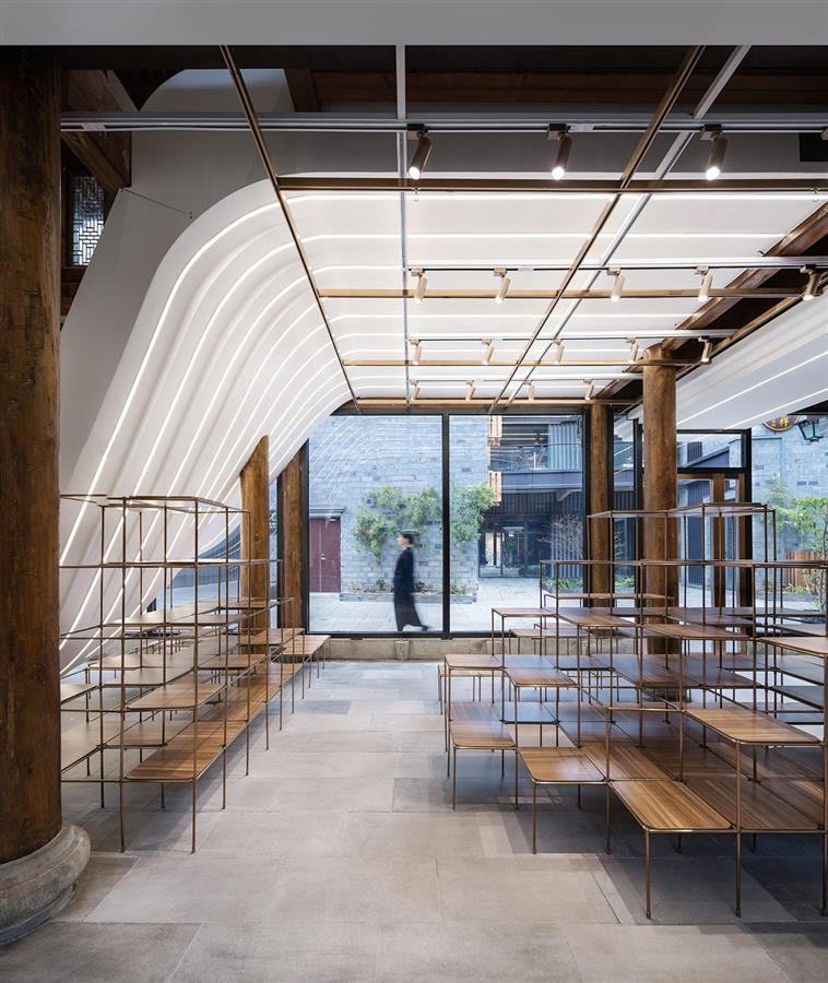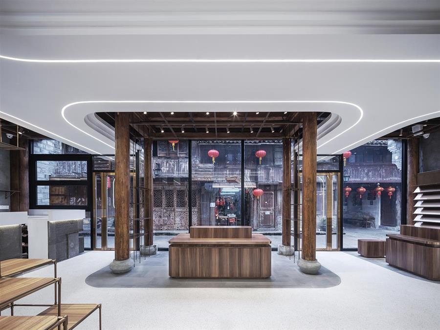 江南贊店鋪面積不大,由一座約200㎡的老房子改造而來,是浙江省古村落基金攜故宮文創(chuàng)幕后推手之一的華胥氏文化,打造的文旅新IP“詩畫江南”首店,其建筑、室內(nèi)及軟裝由零壹城市建筑事務(wù)所一體化完成。
