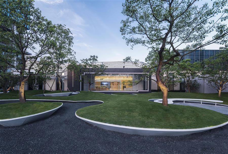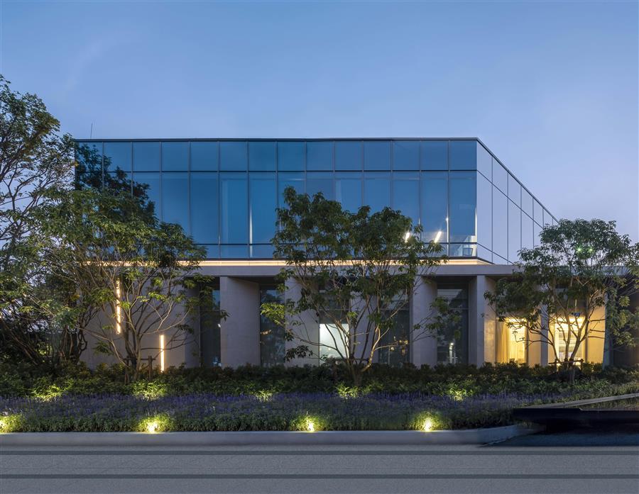 建筑坐落于鏡面之上,水面映襯著建筑現(xiàn)代流線波光如鏡,四周草木繁盛寓“寧?kù)o得以志遠(yuǎn)”,也映襯出使用者內(nèi)心的寧?kù)o與祥和。