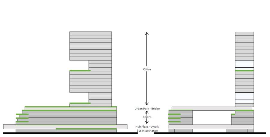設計采用了兩種不同的植物作為建筑綠化,以呈現(xiàn)景觀的雙重性。當使用者進入建筑,郁郁蔥蔥的景觀花園和空中平臺布滿了戶外空間。東側(cè)的建筑,設有專門用于健身的活動空間,屋頂景觀更具活力;西側(cè)的建筑,戶外空間作為社交聚會場所,更具休閑和私密性。空中連廊連接東西兩側(cè)的屋頂區(qū)域,實現(xiàn)了交通樞紐、商業(yè)和市民空間的有機連接??罩羞B廊的外側(cè)采用簡潔、對稱的構(gòu)圖,與橫向的建筑語言彼此呼應。公共通廊自然通風且具有遮陰擋雨的頂棚,在各種交通方式之間提供24小時全天候通廊。