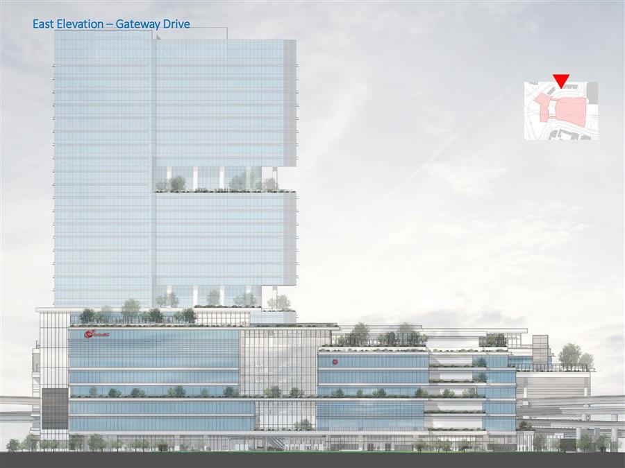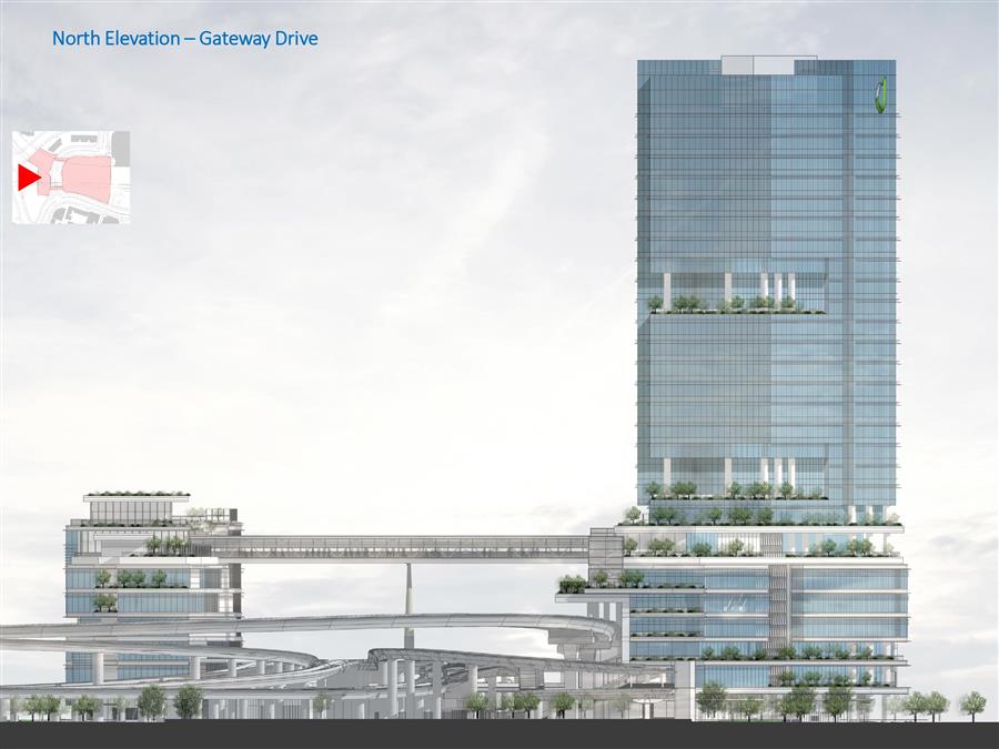 項目包含辦公、公共設施以及零售空間。地塊被軌道交通一分為二,27層的塔樓與8層的裙樓通過空中連廊彼此連接。設計采用水平分層的方式,簡化塔樓體量,加強了不同層級間的連續(xù)性;同時通過公共和休息空間的垂直堆疊,使土地利用最大化。