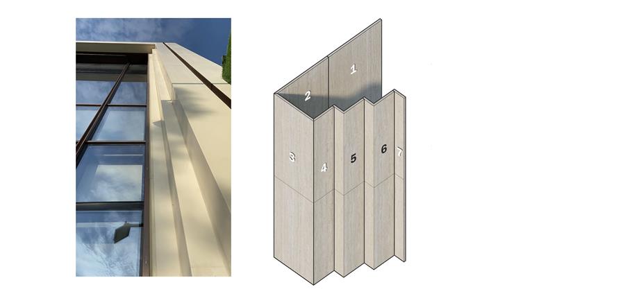 泥客石拼接:1、2、3、4、7號(hào)為單塊板,現(xiàn)場安裝,轉(zhuǎn)角處45°斜切打3mm膠,5、6號(hào)為L形板,在工廠加工好在現(xiàn)場直接安裝,其他交接處自然留縫1-2mm,打膠3-5mm,對(duì)于泥客石45°拼接縫以及垂直拼接的處理,較傳統(tǒng)石材整體性更強(qiáng)。