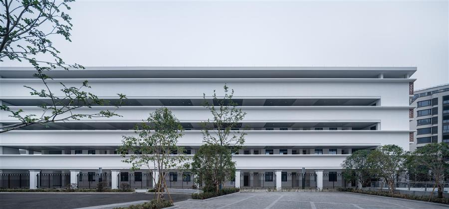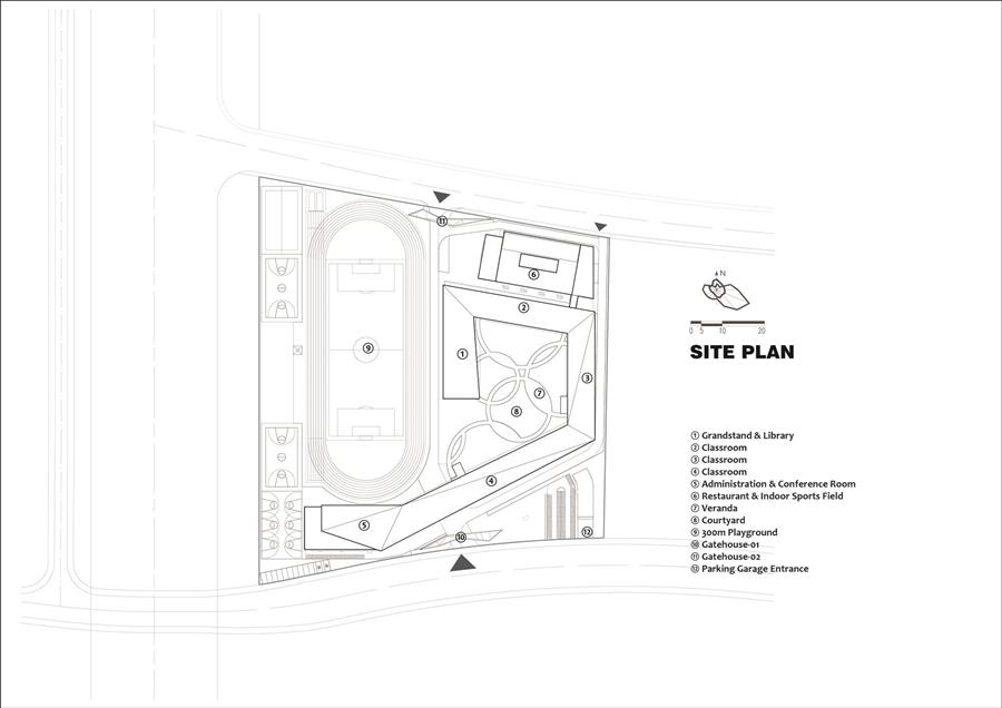 建筑基地處于城市的新發(fā)展區(qū)域,周邊有高密度的住宅和尺度宏大的城市基礎(chǔ)設(shè)施。我們并未延用傳統(tǒng)校園的布局方式,而是將學(xué)校中不同功能的建筑體,視為一個(gè)整體元素,采用“周邊圍合,中部開放”的布局方式,通過讓建筑體沿基地與道路展開,以連續(xù)的折線塑造自身,圍合出相對(duì)獨(dú)立的庭院,既以完整體量呼應(yīng)了城市的尺度,又將基地劃分為開放的運(yùn)動(dòng)區(qū)域和圍合的活動(dòng)庭院。