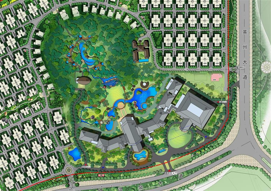 國際農(nóng)業(yè)創(chuàng)新論壇中心坐落于酒店的會議區(qū),以獨棟的莊重建筑形象位于酒店東側(cè),用于承辦各項國際農(nóng)業(yè)科技交流會議。餐飲及康體區(qū)設(shè)置于主體負一層,與園林緊密互動、相互滲透;溫泉區(qū)的泡池像大小不一的藍色珍珠隱于密林中。