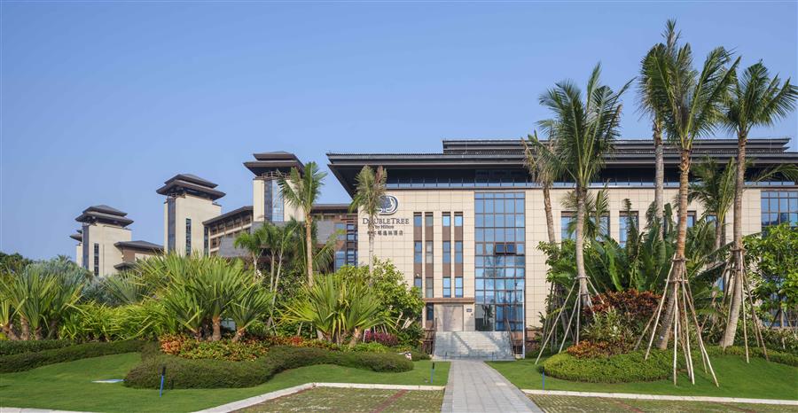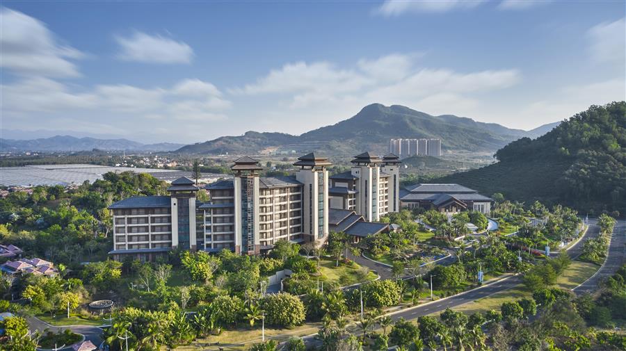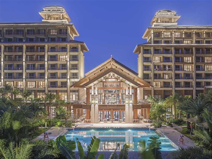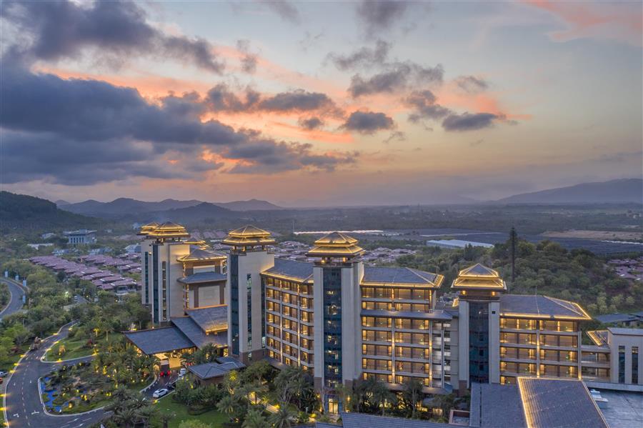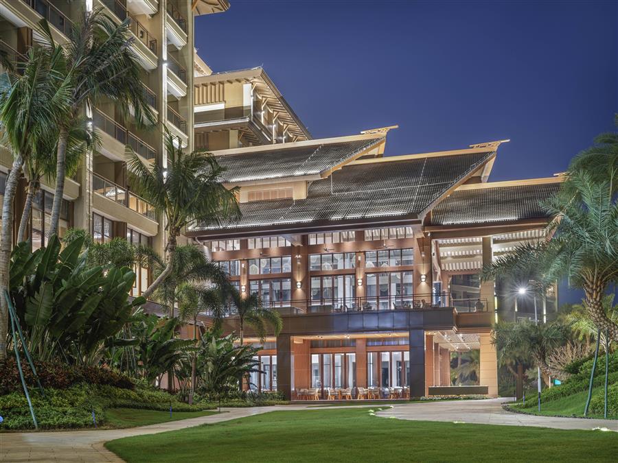 建筑整體順應(yīng)地勢,呈環(huán)抱狀的布局,回應(yīng)著與山體、景觀之間的關(guān)系,以高聳的宮殿塔樓建筑群占地約4萬平方米,酒店客房區(qū)以大堂接待區(qū)為主軸線,面向景觀區(qū)展開,進出道路蜿蜒在熱帶景觀之間,增加酒店的私密性與專屬性。