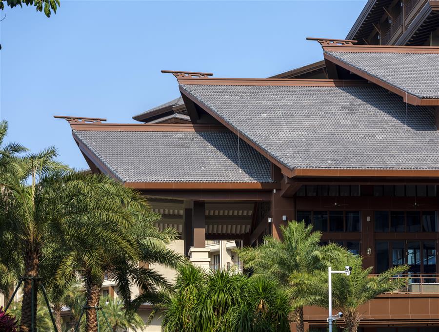 外墻引用了黎族圖騰點綴于細部,溫泉用房以黎族船屋為藍本打造,運用現(xiàn)代設(shè)計手法將其呈現(xiàn)出生態(tài)自然的輕盈造型,注入少數(shù)民族的風(fēng)情色彩,塑造富含地域特色的建筑形象。
