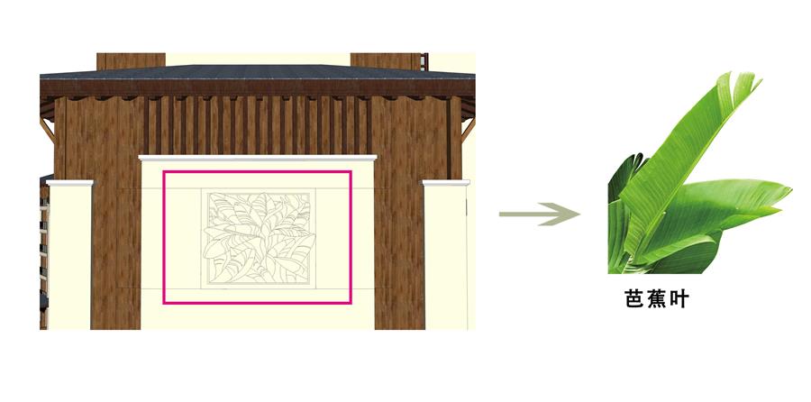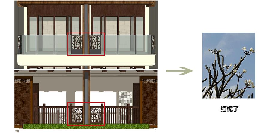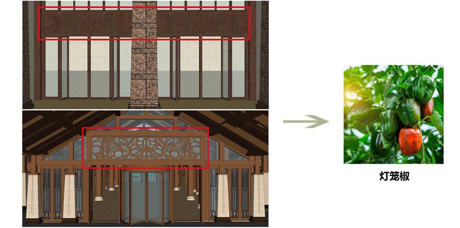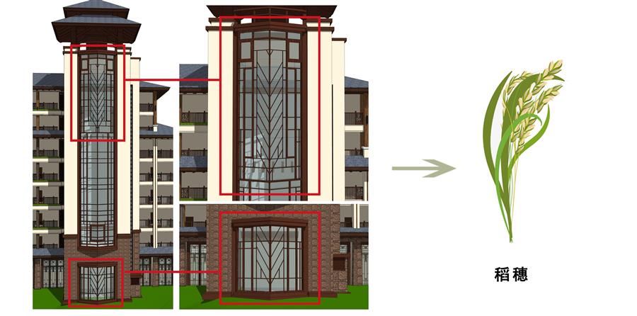 立面設(shè)計提煉了稻穗、芭蕉葉、緬梔子、燈籠椒的元素,將圖案抽象化,運用到主塔立面、門窗、山墻、欄桿設(shè)計當(dāng)中,通過抽象的農(nóng)業(yè)圖案呼應(yīng)場地周邊環(huán)境,體現(xiàn)其生長性。