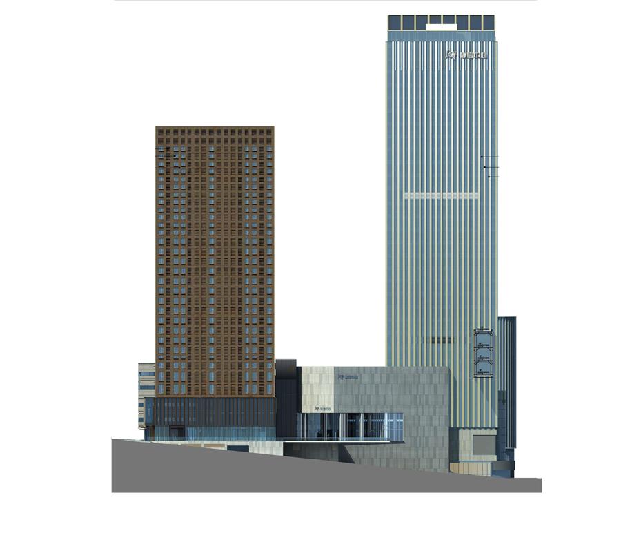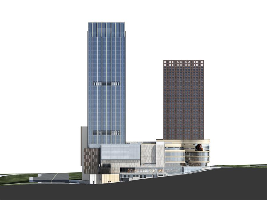 “我們希望充分利用場地極具重慶地形特點的大高差,構(gòu)建不同的城市界面,以不同的商業(yè)場景和多樣的氛圍體驗,將高差劣勢轉(zhuǎn)化為項目特色,打造重慶的商業(yè)新地標。” Aedas全球設(shè)計董事王燁冰如是說。設(shè)計將北側(cè)高點作為生活界面,通過公寓塔樓、電影院及商業(yè)購物中心主入口的形象打造,營造出充滿活力的地標場景;南側(cè)低點以典雅的辦公塔樓與周邊建筑一同營造出高端商務(wù)場景,以兩種情緒反差,為市民提供多樣的空間體驗。