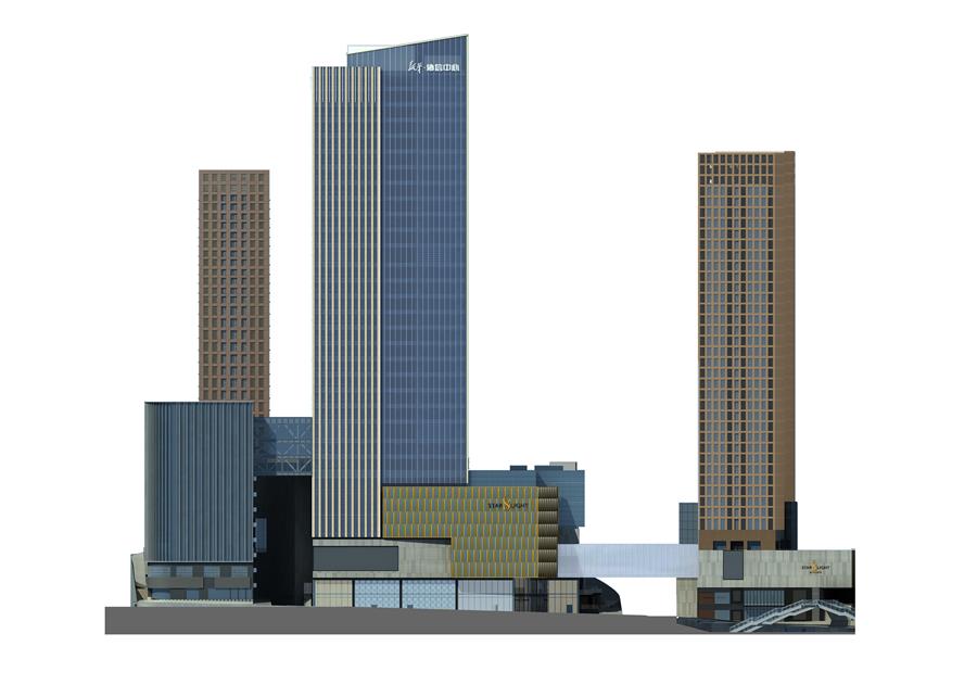 為避免協(xié)信星光68一期與二期間的割裂,團隊從輪廓、功能及外立面多重維度考量,將高層辦公塔樓設(shè)置在同一側(cè),相對而立,利用商業(yè)購物中心作為橋梁,通過地下通道及空中連橋?qū)崿F(xiàn)一期與二期間功能與空間的雙重連接。并基于一致的建筑語言通盤考量建筑輪廓,商業(yè)裙樓以水晶為設(shè)計藍本,大量通透的玻璃體量,與兩側(cè)一期、二期高層辦公塔樓的石材立面形成鮮明對比,高聳的塔樓猶如雙手,將水晶環(huán)抱其中,形態(tài)輪廓上宛如整體。同時二期部分外立面采用一期的材質(zhì),從視覺上加強呼應(yīng)連接。