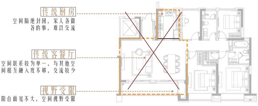 傳統(tǒng)戶型:各功能空間相對獨(dú)立,聯(lián)系不夠緊密,缺少交流。