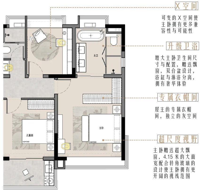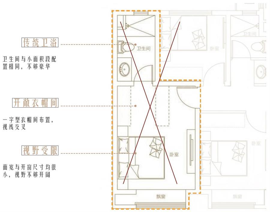 傳統(tǒng)戶型:傳統(tǒng)戶型在主臥的設(shè)計(jì)上衛(wèi)浴空間較小,房間尺度也難以體現(xiàn)大面積段戶型應(yīng)有的配置與尺度,空間舒適度較低。