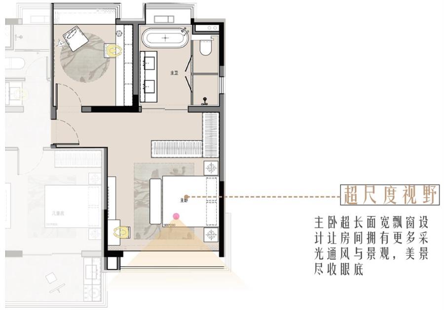 主臥4.15 米面寬,配上通長飄窗設(shè)計(jì),造就超大尺度視野,窗外美景,盡收眼底。