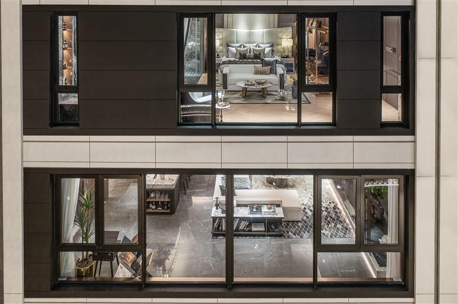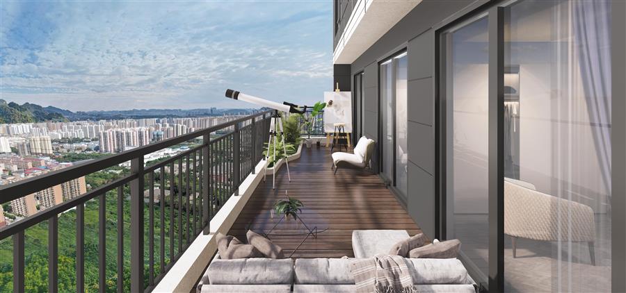產(chǎn)品通過錯層設(shè)置露臺的方式,打造了一個9米通高,270°環(huán)幕視野的空中庭院,將本屬于地面的院落景致移植到空中,讓大平層產(chǎn)品亦可擁有自己的庭院,切實地構(gòu)筑了一方“空中云墅”。