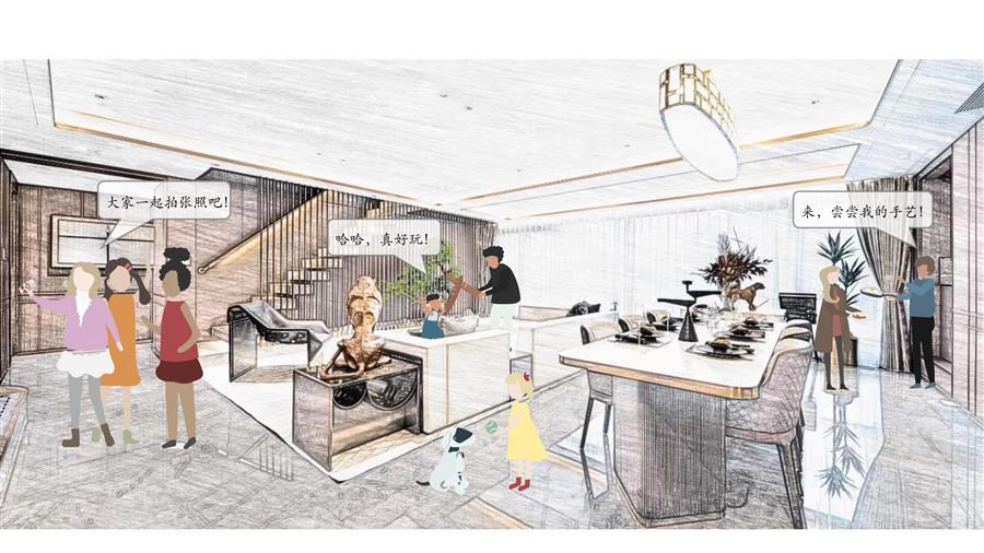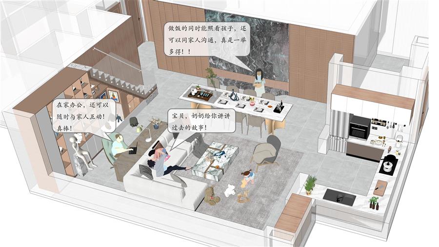 客群描述:這類業(yè)主通常是中青年人,家庭事業(yè)均處于成長期,多種生活場景會在同一時空出現(xiàn)。家庭共享方廳滿足多種生活方式的兼容性,讓媽媽備餐、爸爸工作、孩子學(xué)習(xí)等不同場景在共享方廳里同時上演,營造溫馨和諧的家庭生活氛圍。