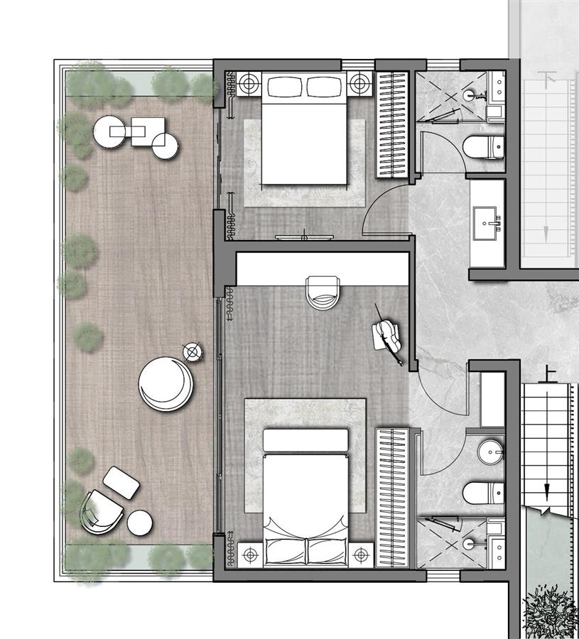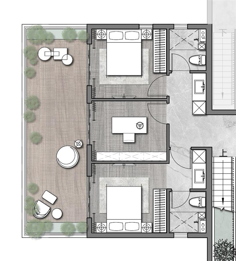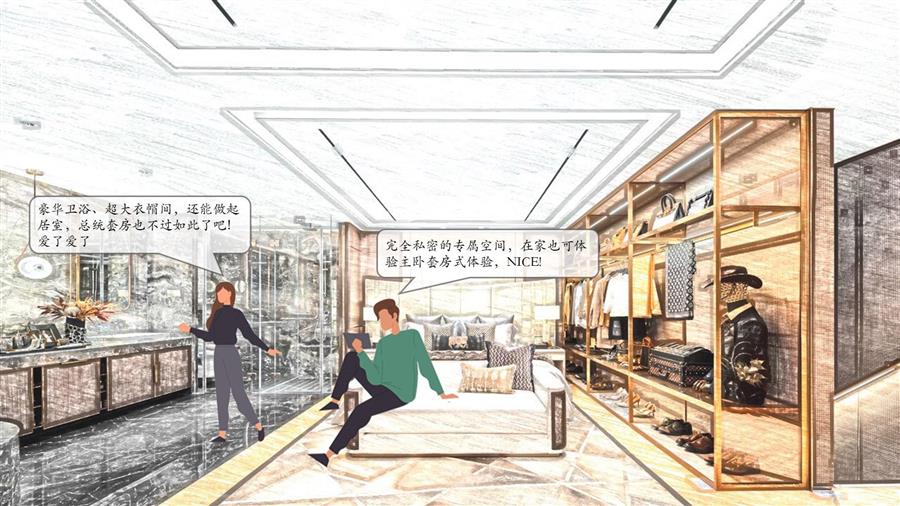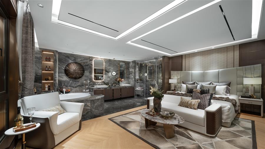 產(chǎn)品自帶溢價空間,業(yè)主可將客廳上方的3m挑空空間加以利用,打造成一個集起居、辦公休閑、衣帽、五件套主衛(wèi)于一體的酒店套房式主臥空間,獨占一層的主臥給業(yè)主帶來絕對私密與尊崇的體驗。