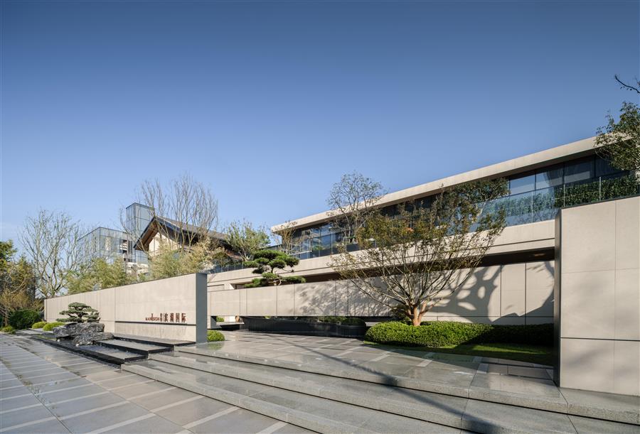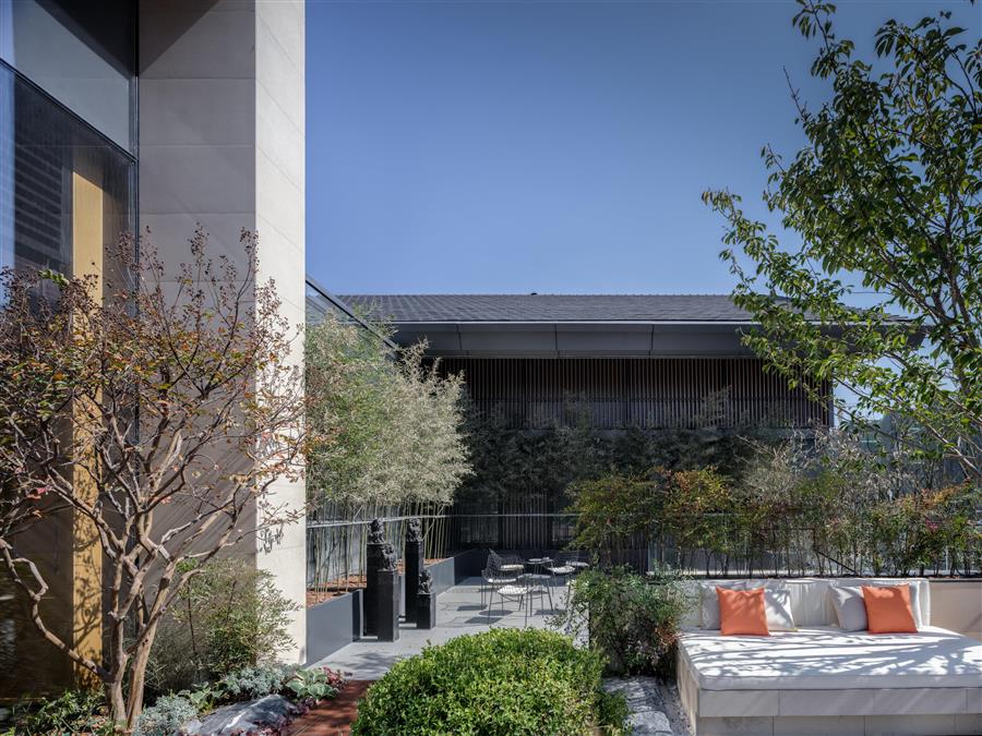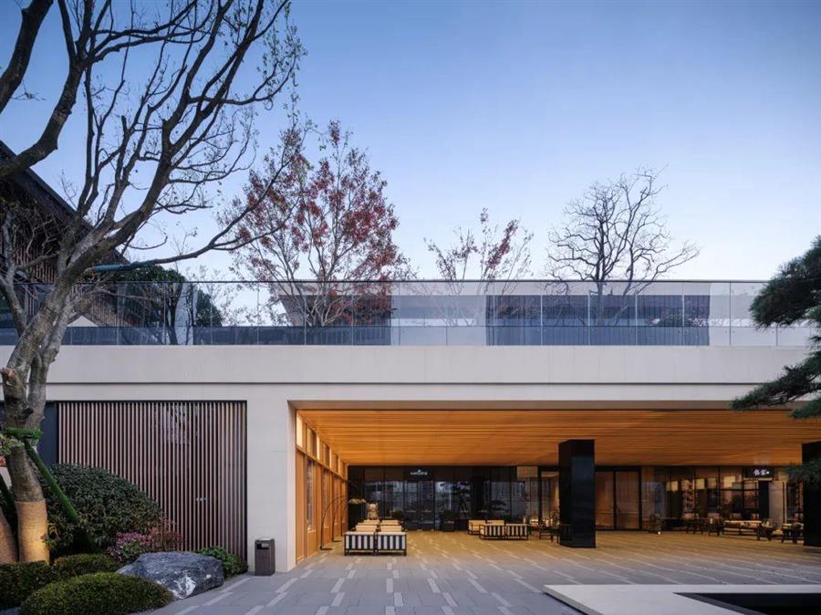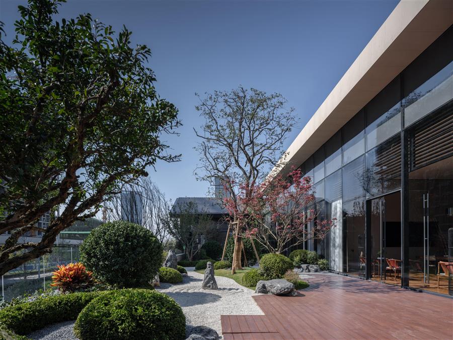 一字街區(qū)內(nèi),由半圍合的景觀擋墻開場,通過迂回的小徑,進入到尺度宜人的迎客休閑空間,穿越簡約幽靜的接待廳,過渡到后場開放的景觀庭院,空間有序展開,節(jié)奏收放有度,營造了豐富的空間體驗。