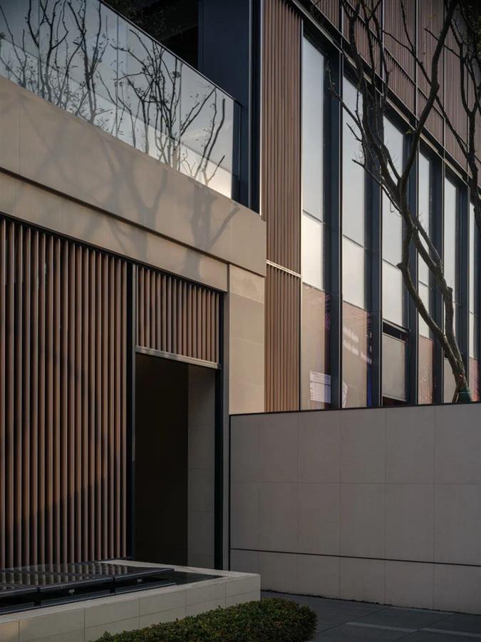 建筑立面材料選擇了方便拆裝的預(yù)制鋁方通,圓弧的處手法讓立面顯得更為精致,豎向線條簡約沉穩(wěn),現(xiàn)代的材料營造出古樸的質(zhì)感。