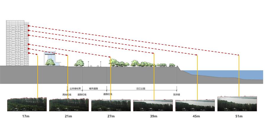 面對(duì)優(yōu)越的江景資源,通過多種標(biāo)高的江景設(shè)計(jì)嘗試,試圖尋找最佳觀景角度。受限于施工條件,最終將示范區(qū)視點(diǎn)確定為15米的高度。
