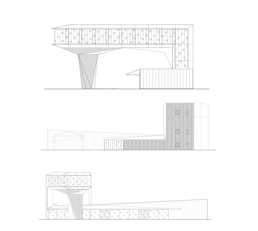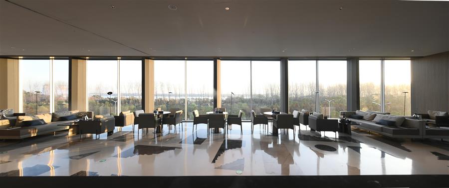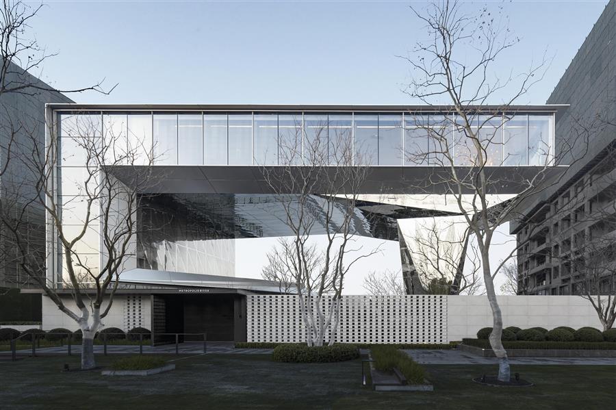 設(shè)計(jì)在沿江面采用了巨大的玻璃面,在室內(nèi)能一覽無余的享受江景,也中和了不銹鋼柱的金屬厚重感;高視點(diǎn)的輕盈建筑形象,形成江景與建筑的互動(dòng),建筑本身也成為江景的一部分。