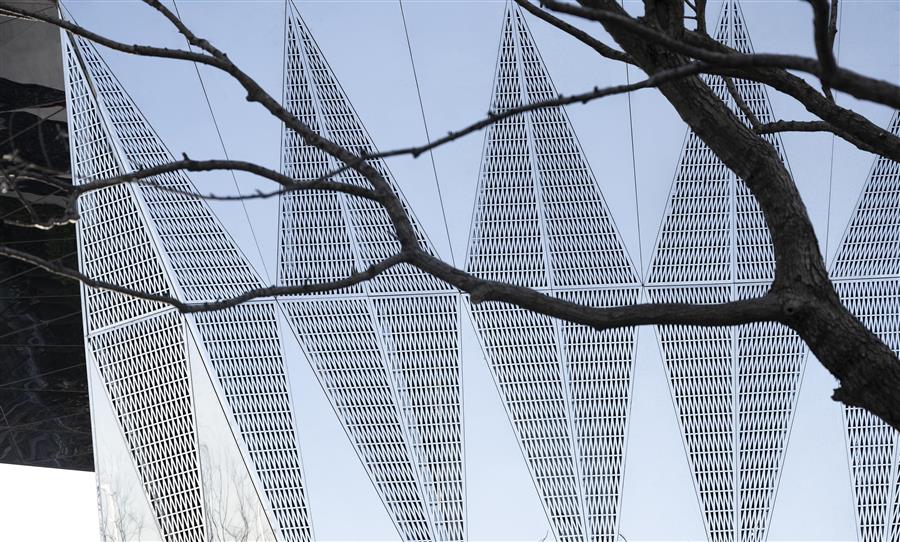 在通風(fēng)百葉的具體設(shè)計(jì)上,采用了與建筑造型母體相關(guān)的三角形不繡鋼穿孔百葉,與其他類似造型的建筑細(xì)部形成一整套完整的設(shè)計(jì)語言。
