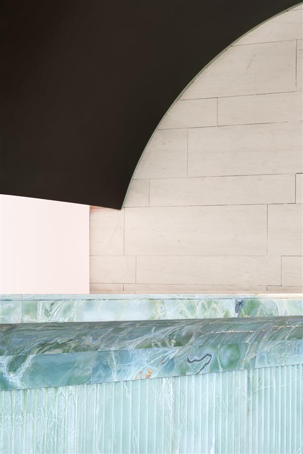 帶有復(fù)古情調(diào)的海邊“空中清吧”詩(shī)意盎然,精致的金屬吧臺(tái)曲面背景與流線型前臺(tái)相呼應(yīng),也與華麗的奢侈品級(jí)青色玉石共同形成“享受時(shí)光流逝”的氛圍。