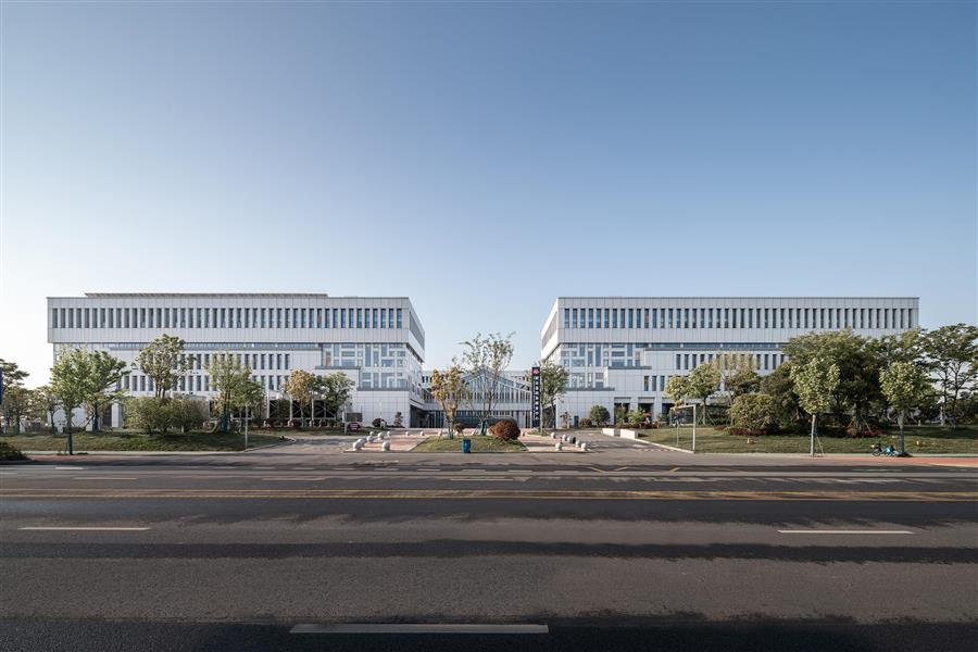 建筑外立面的設(shè)計(jì)采用金屬幕墻與玻璃幕墻相結(jié)合的現(xiàn)代設(shè)計(jì),運(yùn)用富有韻律變化的立面設(shè)計(jì)手法,創(chuàng)造出蘊(yùn)含傳統(tǒng)意境的建筑形象,找尋昔日徽派建筑馬頭墻的集體記憶。作為政府對外形象的展示窗口,建筑形體簡約大氣,富有莊重感。