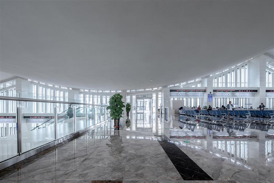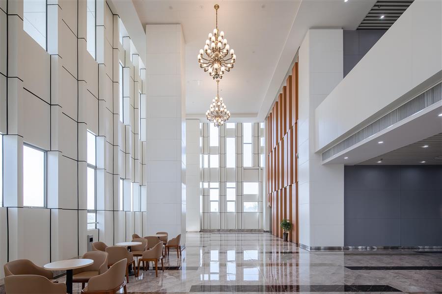 在建筑的室內(nèi)同樣傳達(dá)了徽派建筑設(shè)計(jì)概念,樓宇內(nèi)部弧形曲線為空間注入活力,曲線型屋面的玻璃、石材和金屬之間的碰撞,令整個(gè)空間風(fēng)格具有區(qū)域特色而不失現(xiàn)代時(shí)尚,整體氣氛極具凝聚力,是建筑最為靈動的亮點(diǎn)。