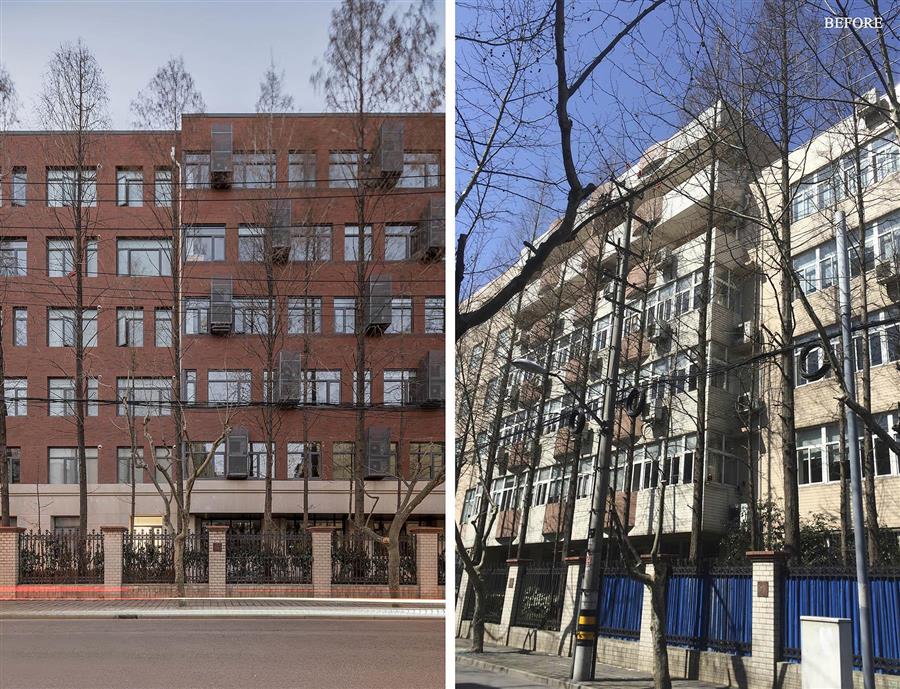 為了呼應校園內(nèi)另外兩棟“紅磚”教學樓,同時契合附中悠久的歷史傳承和開拓進取的精神內(nèi)核,我們采用紅色飾面磚為底白色石材線條穿插其中,再以深灰色點綴,一改原教學樓重復單調(diào)的立面,為歷史悠久的校園注入新的活力。