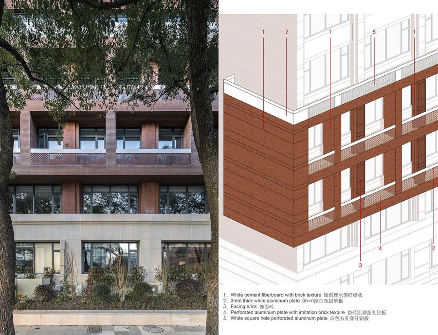 博學外立面在設計伊始便將可實現(xiàn)性考慮在內(nèi),為了不給教學樓增加額外的荷載,我們拆除部分厚重的窗間墻和挑板以減輕自重,再使用重量相對較輕的水泥纖維板和穿孔鋁板作為外立面的裝飾材料,在紅磚帶來的厚重感和歷史氣息之余,為建筑增加一抹靈動和現(xiàn)代氣息。