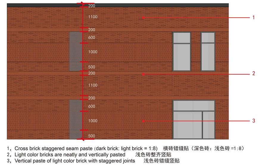 在博學樓極大部分區(qū)域我們使用了傳統(tǒng)的飾面磚,在磚的貼法上我們力求改變,用兩種顏色的磚和三種不同的貼法的組合去突破磚紋肌理立面所帶來的的古板和單調(diào),隱約間為立面增強了橫向的韻律。