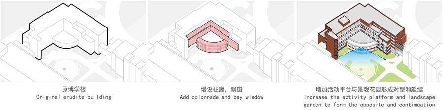 △在原本的教學樓2、3和5層增加飄窗,在入口處增設雙層柱廊,讓視線更加開闊,空間更加豐富