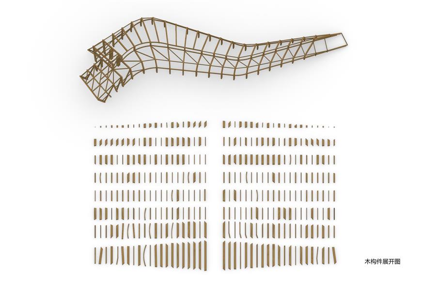 一層結(jié)構(gòu)以花旗松膠合木為主,局部核心筒為混泥土結(jié)構(gòu)。具有序列感的木構(gòu)體系,就如蘭花的根莖一般,自由生長(zhǎng)又有規(guī)律可循,支撐著建筑主體。這種結(jié)構(gòu)特性能夠回應(yīng)實(shí)質(zhì)的空間需求,是內(nèi)涵與形式的統(tǒng)一,空間與外在形式的統(tǒng)一。