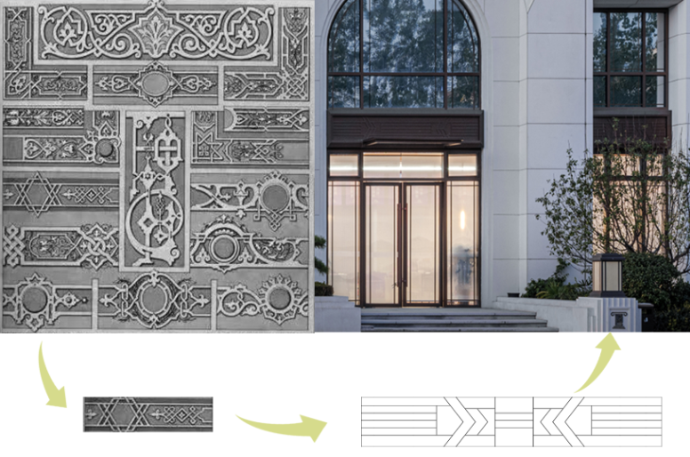 古典紋樣簡化賦能,幾何形制提煉重組,集中打造入口空間,用現(xiàn)代的手法提升建筑精致感。建筑360°精雕每一處細(xì)節(jié),將建筑語言轉(zhuǎn)譯為更簡練的形制,以更為隱逸的語言呼應(yīng)新生代的審美傾向。