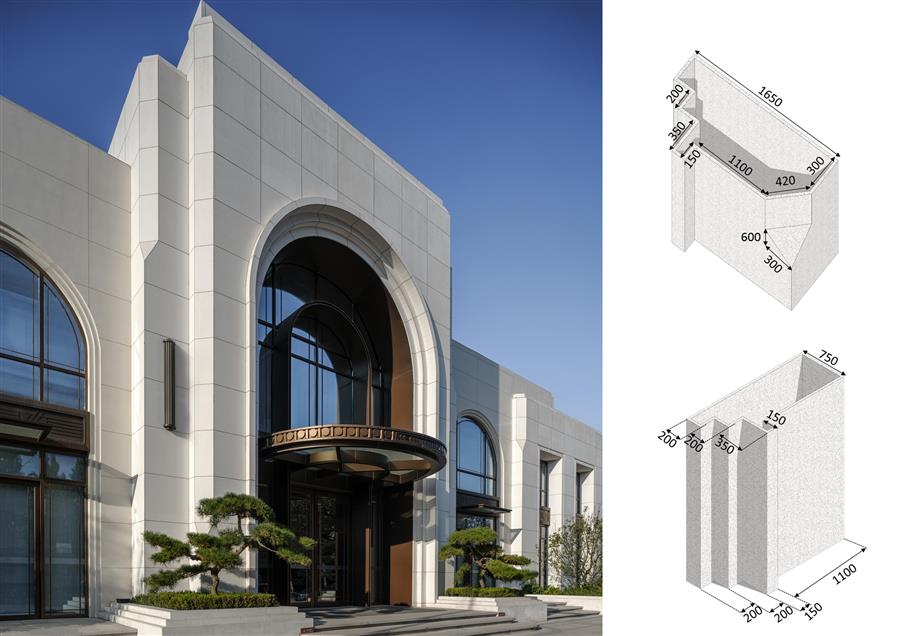 為追求形體高低變化,入口拱門中間位置局部結(jié)構(gòu)加高,利用石材干掛技術(shù)包出凹凸變換的造型,女兒墻最低控制在650mm,滿足屋面防水施工做法的同時(shí)保證立面效果。