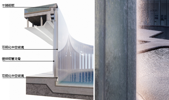 鏡面水化為瀑布跌落,成為了人與自然之間的媒介,同時(shí)可消弭環(huán)境噪聲,強(qiáng)化場所氛圍。