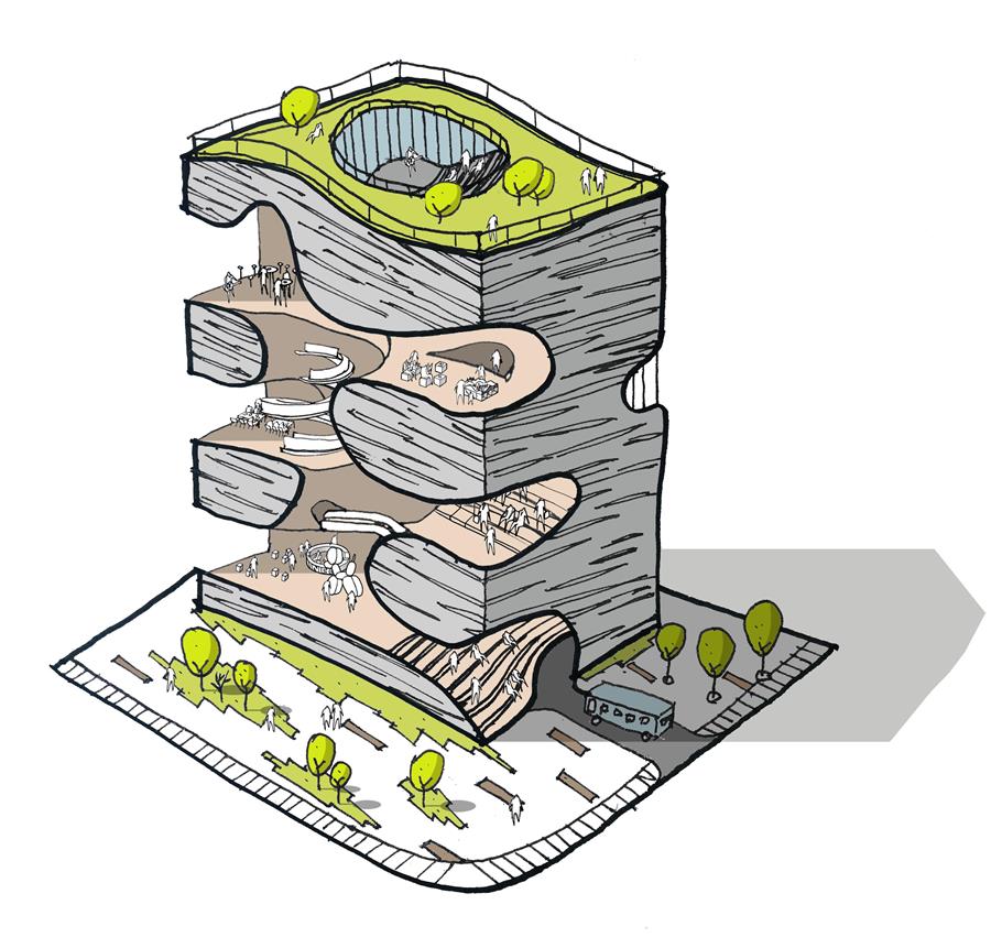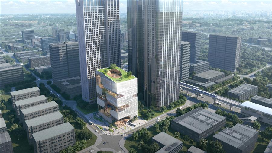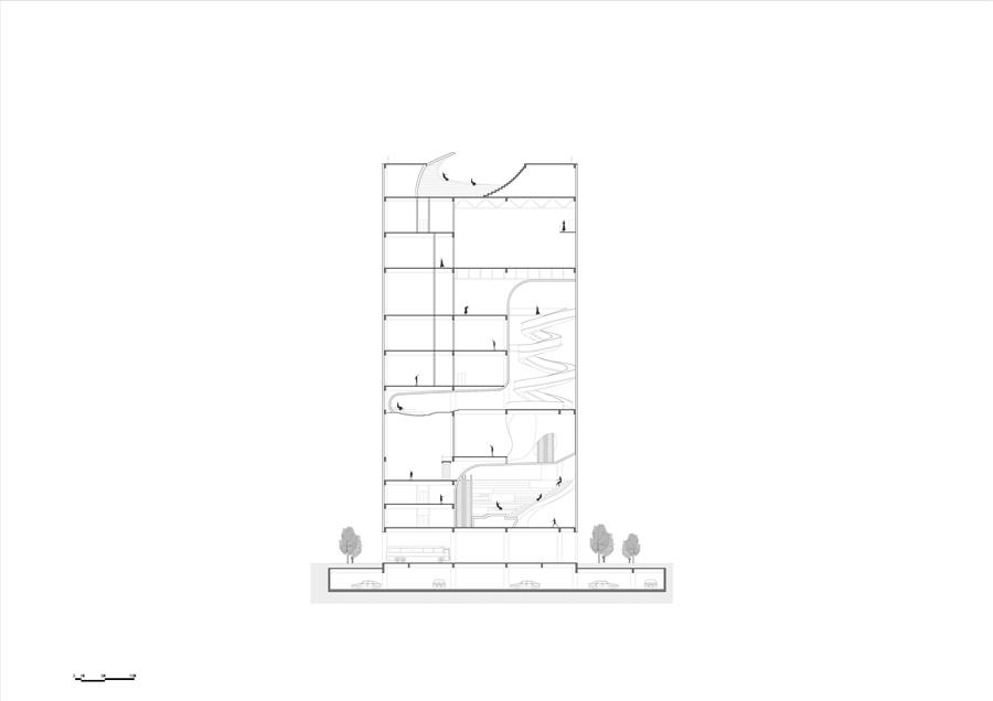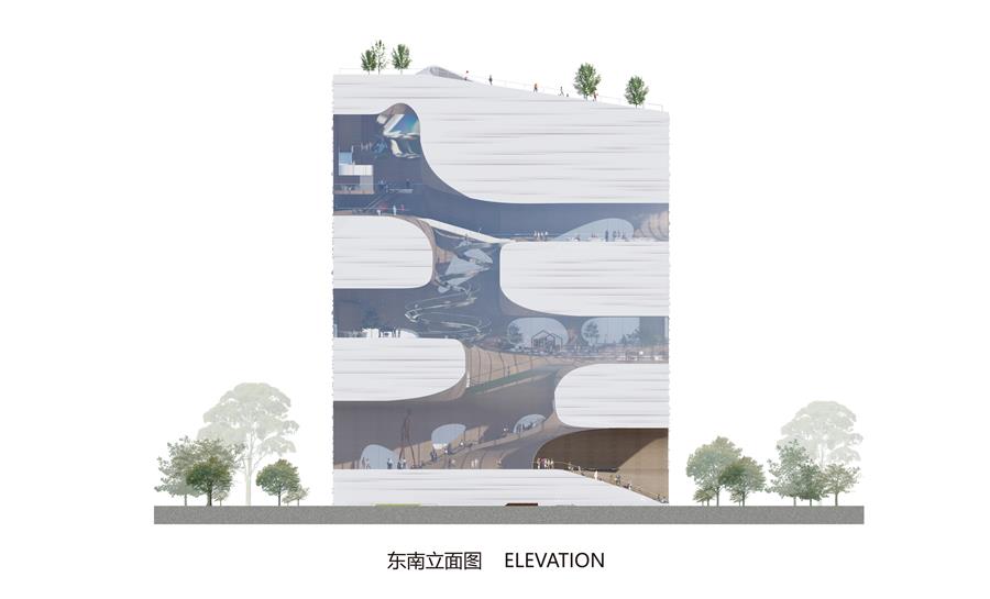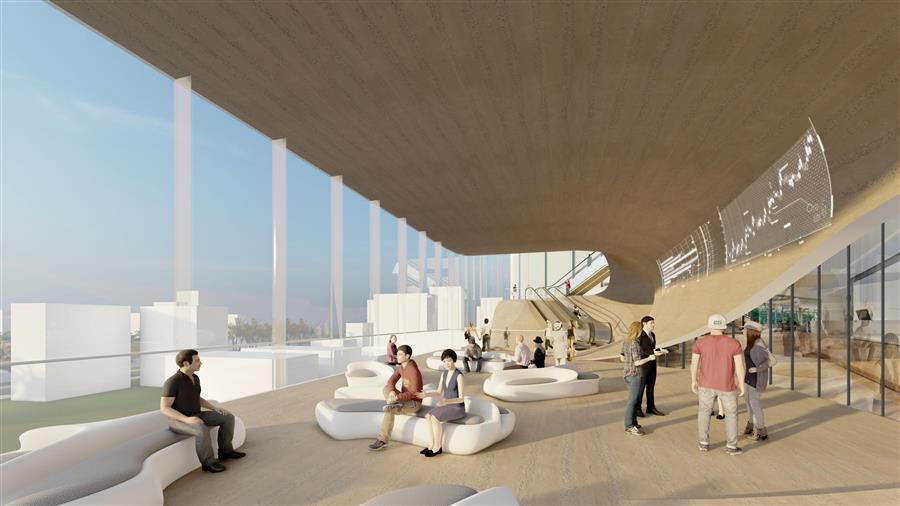 通過空間的抬升和視野的延展,鼓勵(lì)人們探尋不同空間與維度上的視覺觀感,流動(dòng)藝?yán)纫员P旋的姿態(tài)不斷上升,最終在頂部為人們呈現(xiàn)一片壯闊的城市視野。