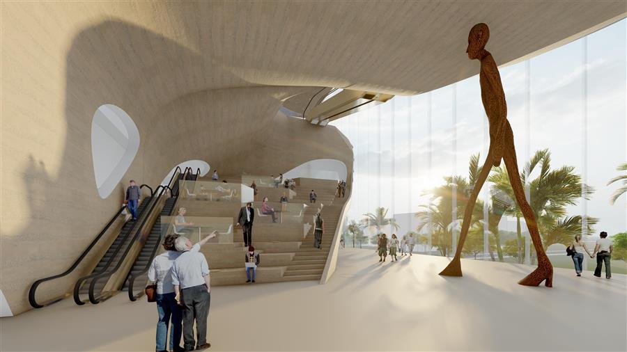 在高尺度的公共空間內(nèi)部,置入休憩大臺階與文創(chuàng)商店。引入人流的同時(shí),還提供了群眾交流、聚集與觀展的空間,將入口打造為復(fù)合多元化的空間。