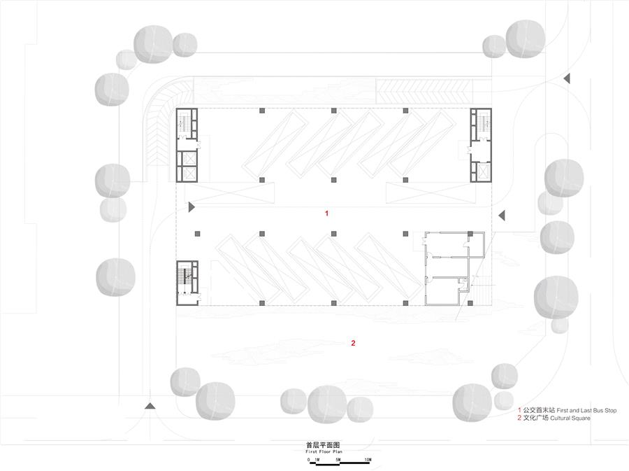 同時(shí)為了更積極地回應(yīng)城市的訴求,設(shè)計(jì)團(tuán)隊(duì)提出“公共空間返還率”的概念,將文化中心定義為一個(gè)新型的全時(shí)段公共空間,白天所有的空間對外開放,閉館后的流動(dòng)藝?yán)纫廊幌蚴忻耖_放,使其因時(shí)間和空間上的多種利用而衍生出更多的價(jià)值。