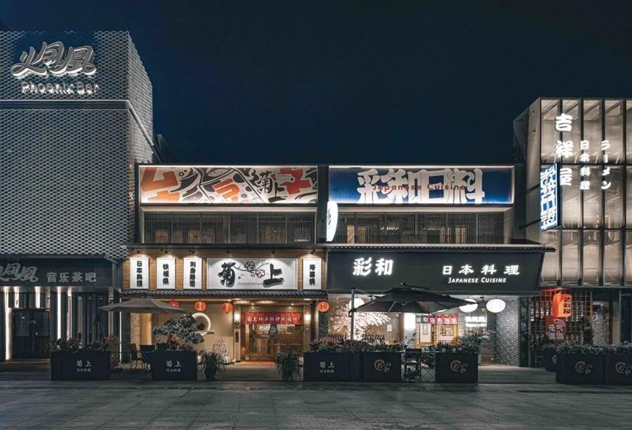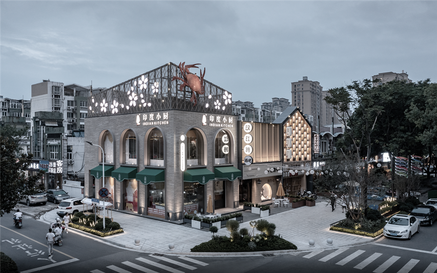 在街區(qū)立面改造設(shè)計中,可以運用色彩、燈光、聲音多種手法,調(diào)動人們多重感官體驗。作為改造提升的亮點,設(shè)計團隊對幾個重要節(jié)點運用了有新鮮感的材料和手法,給項目帶來更多潮流感與活力。