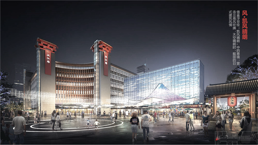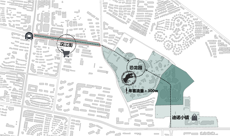 項目位于地鐵新區(qū)公園站到常州恐龍園之間,是游客乘地鐵到恐龍園的必經(jīng)之路,是旅游度假區(qū)的“延展區(qū)”?!叭诤衔穆蒙?,打造特色旅游度假街區(qū)”,打造“恐龍園+漢江街”雙名片,打造集“國際化、年輕化、多元化”于一體的城市新地標(biāo)成為本項目設(shè)計出發(fā)點。