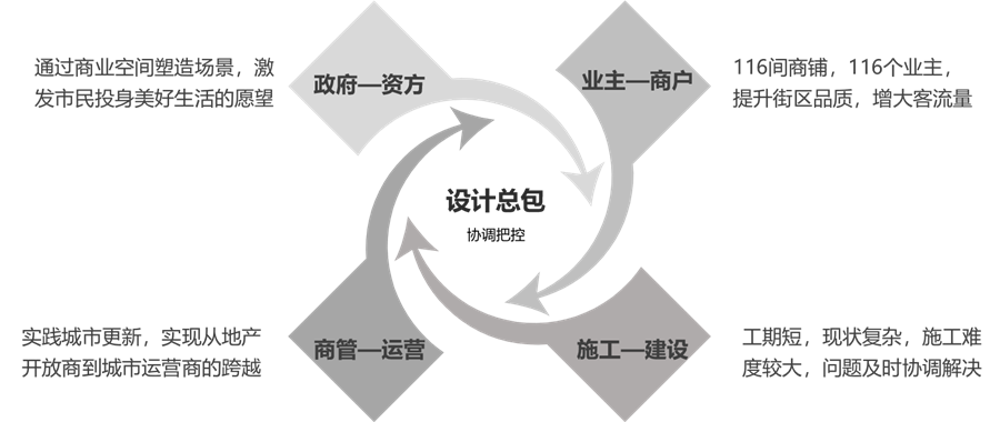 漢江路項目為多方配合項目,項目的成功首先得益于有能力、有擔(dān)當(dāng)?shù)恼块T,不拘泥于單個項目本身的收益平衡,更是看到這個項目對區(qū)域帶來整體提升的潛力;其次需要經(jīng)驗豐富,有招商整合和運營能力的商管團隊;也需要有全過程咨詢能力的總包設(shè)計團隊,才能突破重重挑戰(zhàn),獲得社會資源的最優(yōu)配置,以及工期、成本和效果的多重平衡。